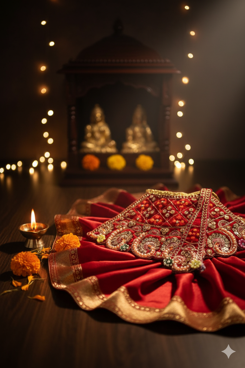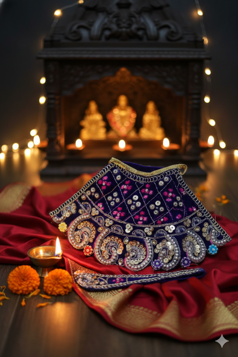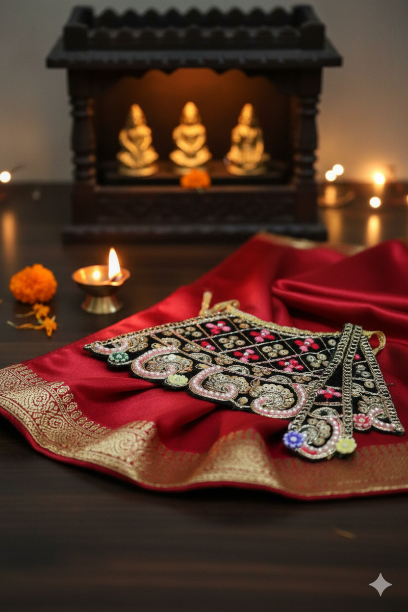 Add divine elegance to your deity idol or classical dance costume with this handcrafted Lakshmi dress accessory. Made with vibrant green satin fabric, this set features intricate hand embroidery, beadwork, and sequin embellishments in traditional motifs. Perfect for Goddess Lakshmi idols, Golu dolls, or Bharatanatyam/Kuchipudi dance costumes, this accessory set brings out the festive spirit with grace and sparkle.