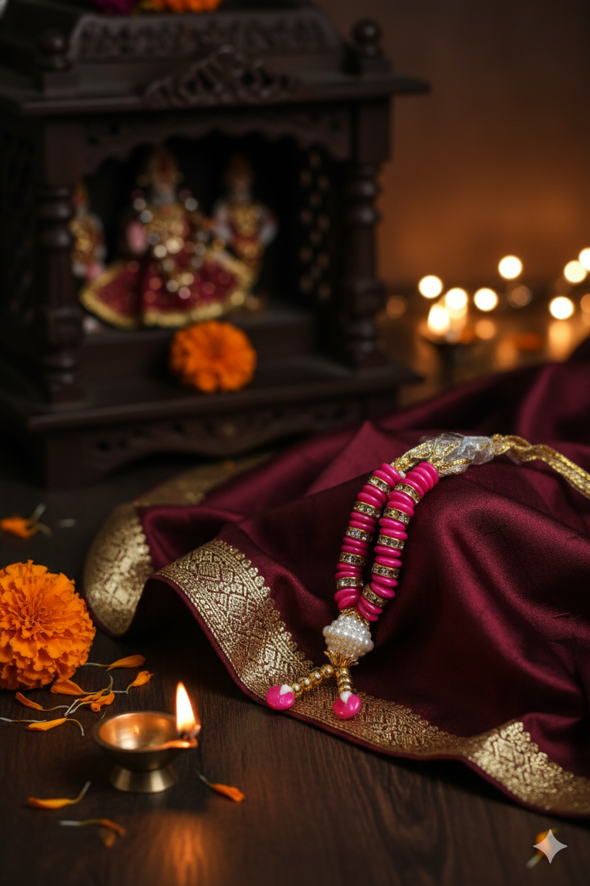The Moti Mala is a traditional prayer bead garland used during Hindu rituals, bhajans, aartis, and temple decorations. Made with high-quality artificial pearls, this mala is ideal for adorning deities, mandirs, kalash, and pooja thalis. It adds a pure, devotional, and elegant touch to your spiritual setup.