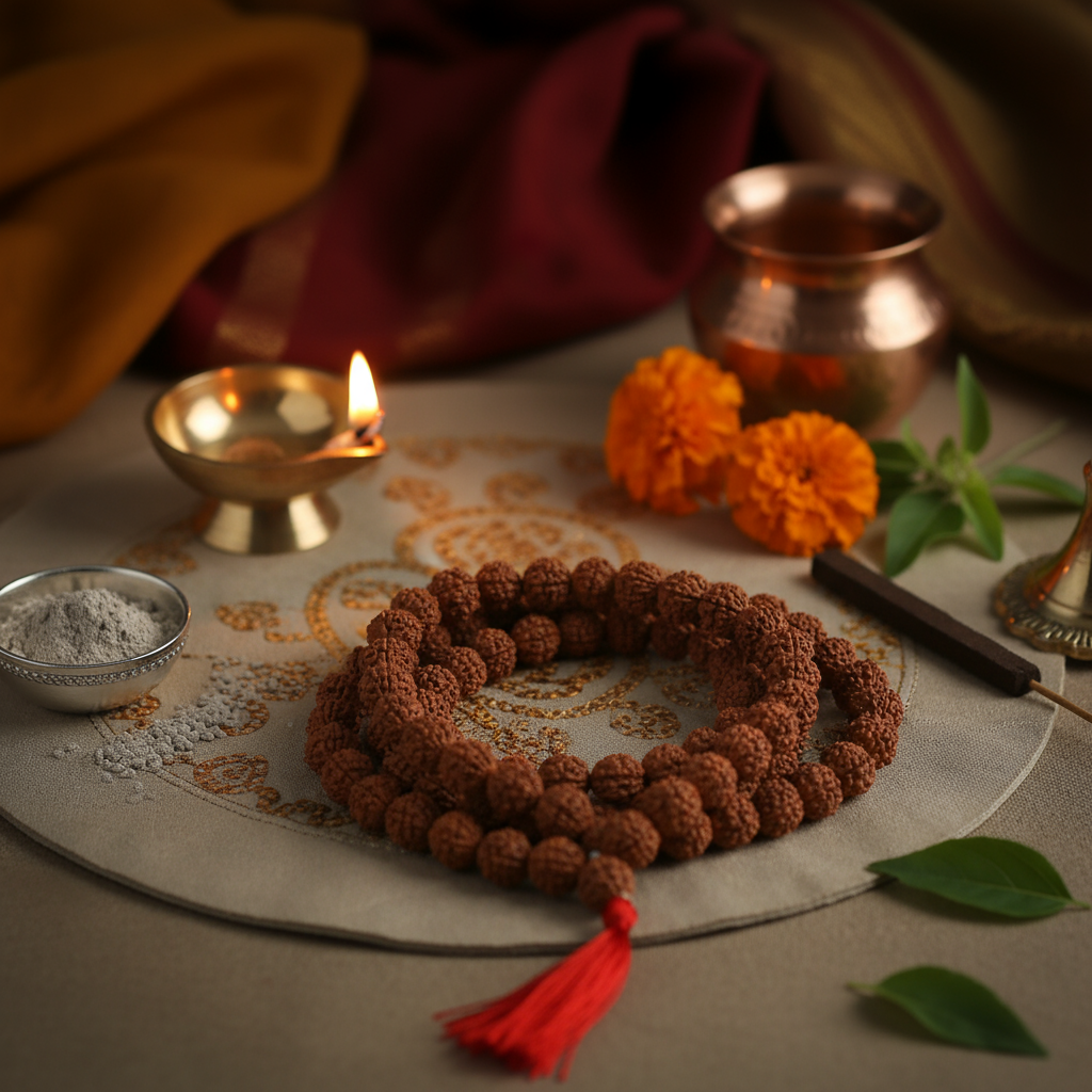The Rudraksha Mala is a powerful spiritual accessory made from natural Rudraksha beads, traditionally used in Hinduism, Buddhism, and yogic practices for japa (mantra chanting), meditation, and healing.